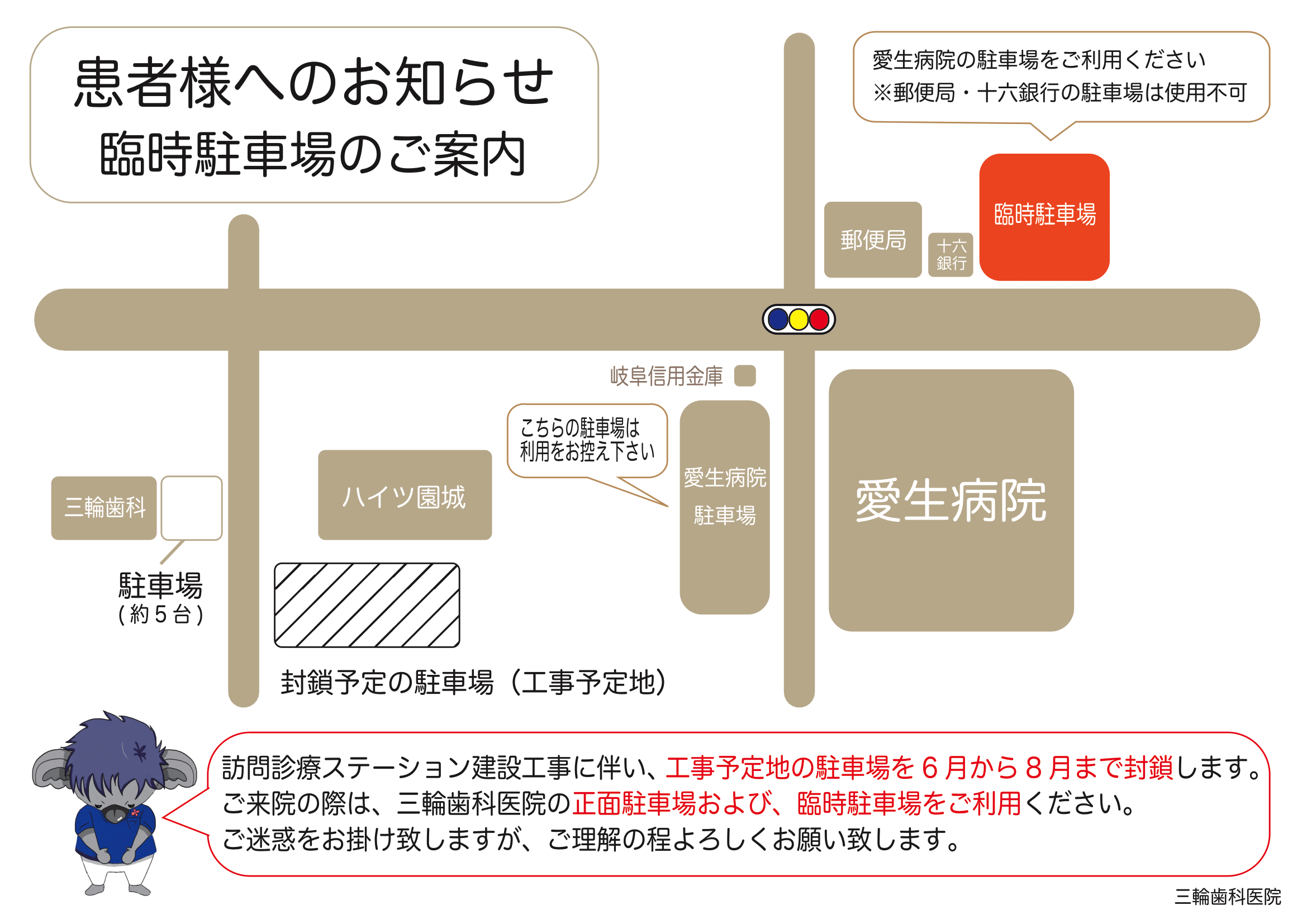 訪問診療事務所建設工事に伴い、工事予定地の駐車場を6月20日(月)から封鎖します。 ご来院の際は、Ihana歯科岐阜の正面駐車場および、臨時駐車場をご利用ください。 ご迷惑をお掛け致しますが、ご理解の程よろしくお願い致します。
